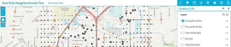 “GIS mapping and analysis was a requirement and the LISC NY team knew GIS services were important to supporting the overall East Side project. The project web map is ArcGIS Online based with the data stored in a Hub Site (to allow for data sharing) and was designed about halfway through the GIS mapping and analysis task to support the WITHIN planning process itself. “